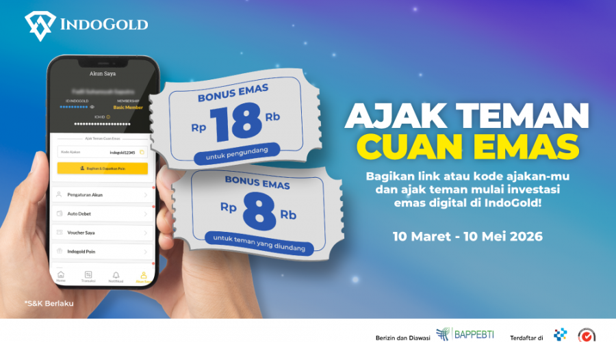 Dapatkan IndoGold Poin senilai Rp18 ribu , setiap kali kamu berhasil mengajak teman bertransaksi di IndoGold minimal Rp100 ribu dengan menggunakan link ajakan atau referral milikmu. Teman yang diundang akan mendapatkan IndoGold Poin senilai Rp8 ribu. Periode : 10 Maret - 10 Mei 2026 Cara …