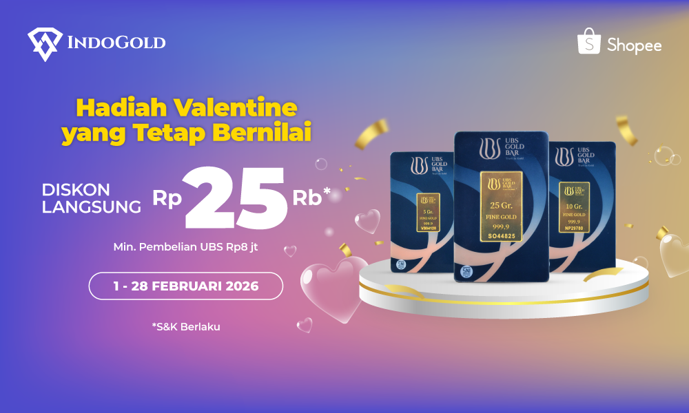 - Diskon hanya berlaku untuk pembelian emas batangan UBS, dengan minimal pembelian Rp8 Juta di Official Indogold di Shopee diskon langsung Rp25 ribu.