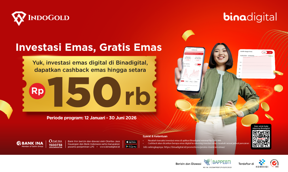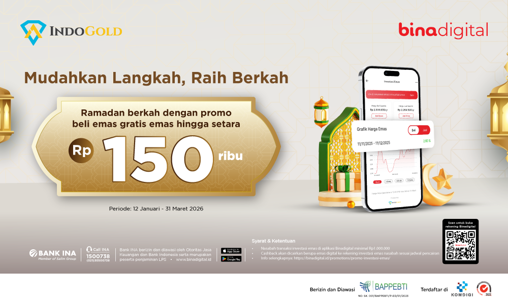 Cashback emas hingga Rp150 ribu untuk pembelian emas di aplikasi Binadigital.