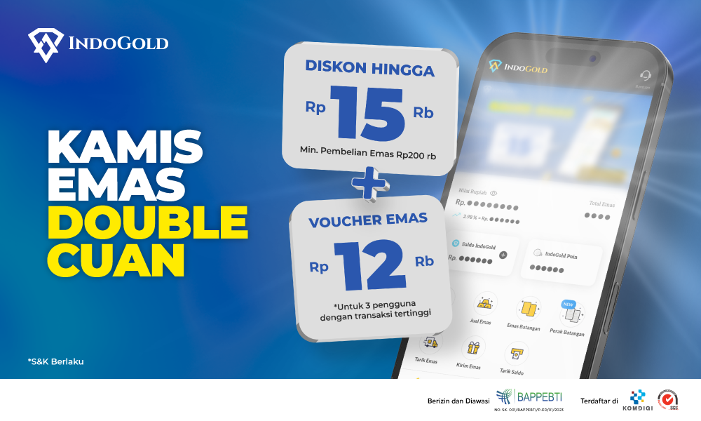 Nabung emas min. Rp200 ribu di aplikasi IndoGold dan dapatkan diskon langsung 1,8% maksimal potongan Rp15 ribu + voucher senilai Rp12 ribu bagi 3 pengguna yang memakai voucher Kamis Emas dengan pembelian tertinggi