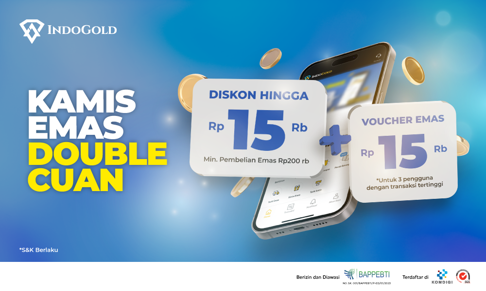 Nabung emas min. Rp200 ribu di aplikasi IndoGold dan dapatkan diskon langsung 1,8% maksimal potongan Rp15 ribu + voucher senilai Rp15 ribu bagi 3 pengguna yang memakai voucher Kamis Emas dengan pembelian tertinggi