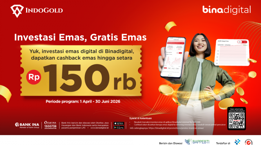 Investasi emas IndoGold di Binadigital, bisa dapat gratis emas! Cashback emas hingga Rp150 ribu untuk pembelian emas di aplikasi Binadigital. Periode program : 12 Januari - 30 Juni 2026 Syarat & Ketentuan: Periode program berlaku 12 Januari - 30 Juni 2026.Nasabah Binadigital …